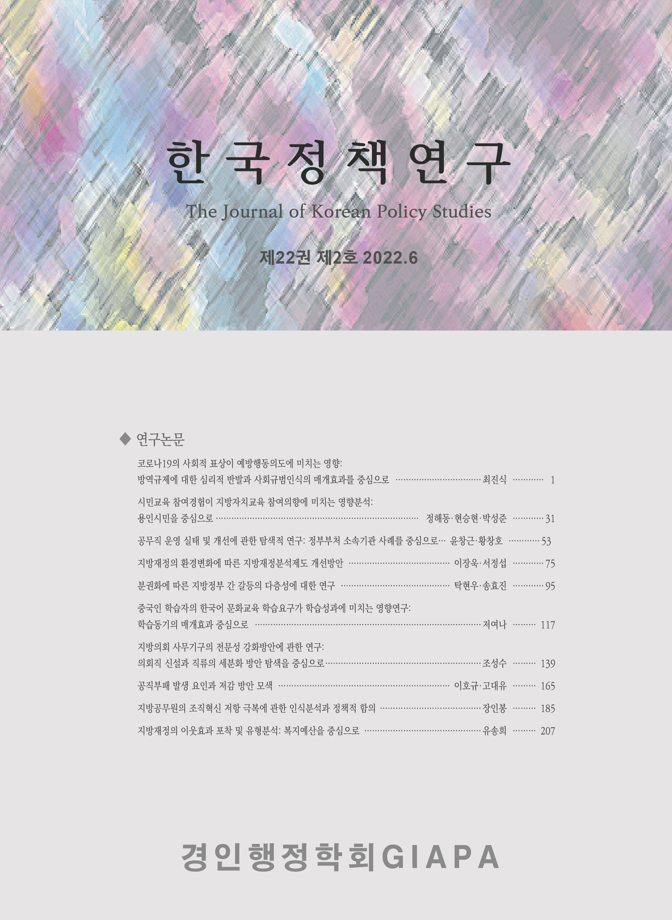 - 이전논문시민교육 참여경험이 지방자치교육 참여의향에 미치는 영향분석: 용인시민을 중심으로 An Analysis of the Influence of Citizen Education Participation Experience on the Intention to Participate in Local Autonomy Education: Focused on Yongin Citizens