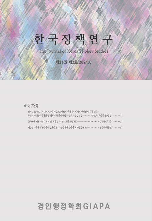 - 김호균 / 2007 / 문화정책집행영향요인과 집행효과성과의 관계 분석 / 정책분석평가학회보 17(1):167~192 dbpia